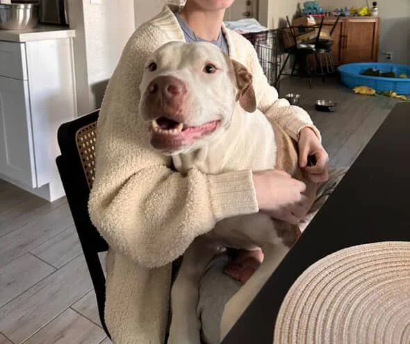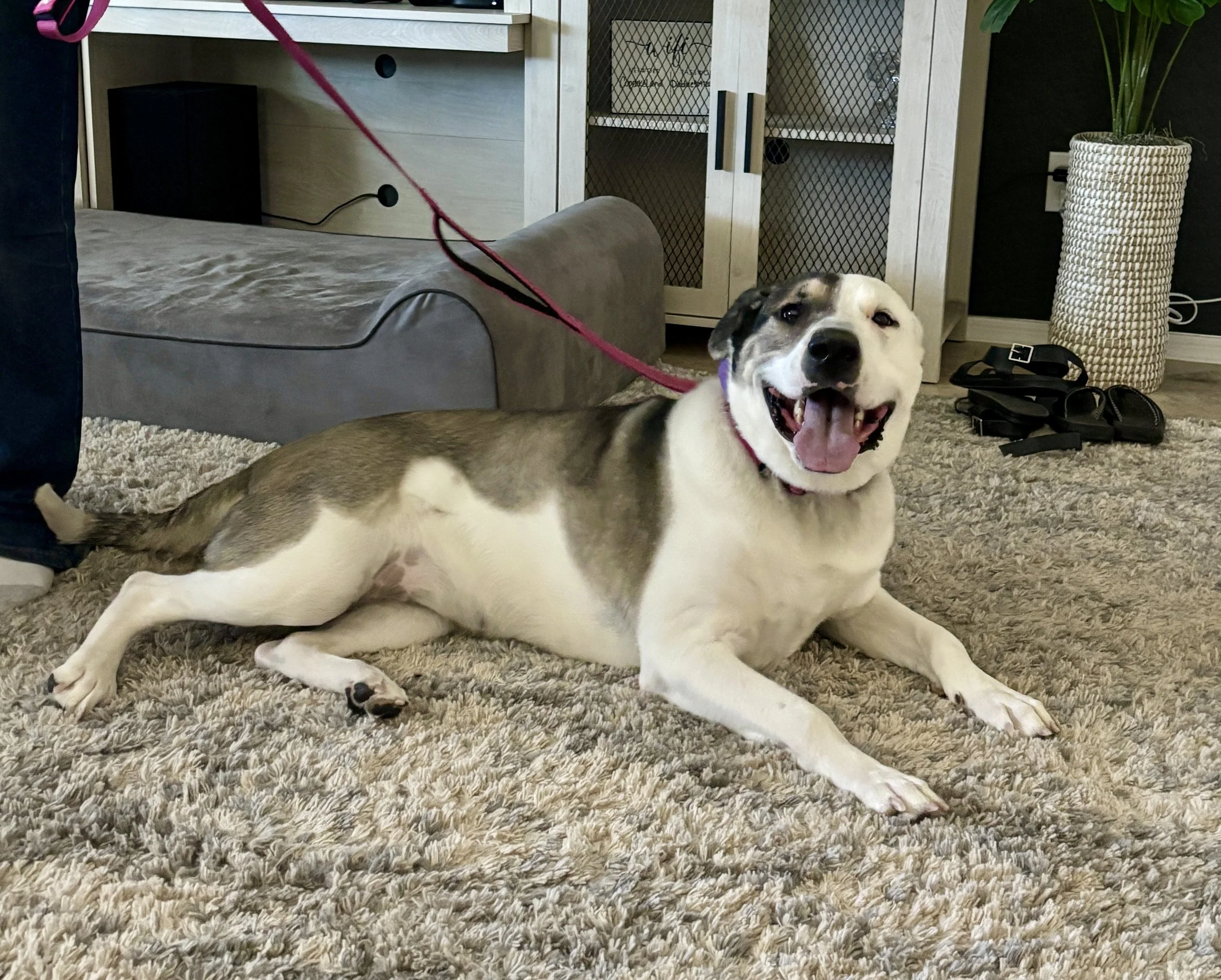 Roxy has been through so much and deserves so much love. She had a tough start to her life as a puppy, but she is ready to meet & love her forever family! She would do best in a home with a strong owner, as she is a solid 75 lbs. She walks well on a leash and loves attention and cuddles. She is estimated to be born in September 2024 so she is almost 1 years old. She is going through board and train as of May 28, 2025. If you’d like to learn more about her, please contact us!
